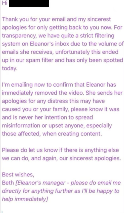 What is more, deleting the video proved that her email was read and taken seriously, but with the completely wrong attitude.