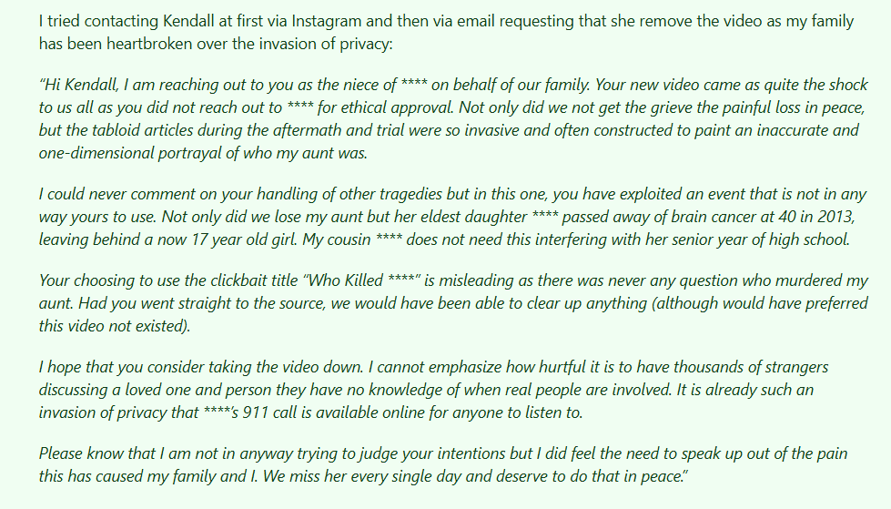 In this Reddit Post dated 2 years ago, a victim’s niece, who recounted having had a very close relationship with her aunt, described her shock and revulsion at Kendall Rae’s video, based on her aunt’s murder by an employee whose fraudulent behaviour she had discovered. The video was released 16 years after the murder, and as her aunt had been a successful real estate agent, details Rae used largely came from tabloids, which had hounded the family at the time, embellishing and speculating disgracefully.