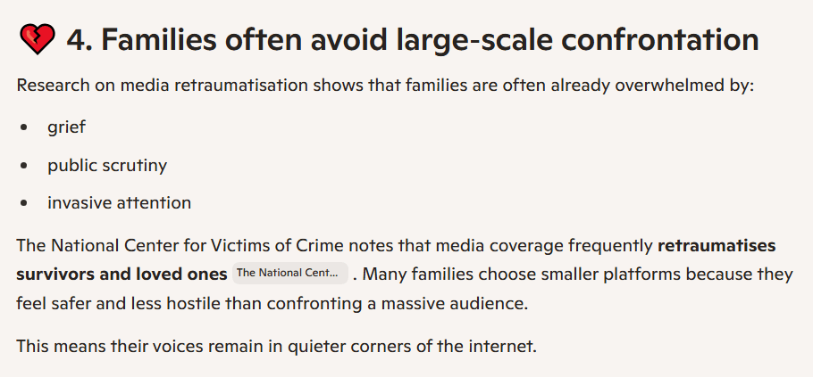 There is a huge difference between covering a story one is invested in, possibly with the family’s input (such as a disappearance, a murder that the family feels was mishandled etc.), trying to help people who still seek answers or justice, and simply having an output schedule (like a video per week) in order to maintain your income, sensationalising random murder stories to feed to the audience. It becomes about money and consumption, if not entertainment, as described below.
