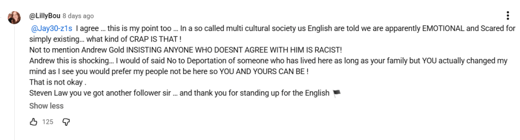 In the video screenshotted below, the guest, Steve Laws, was dubbed Britain’s biggest racist by Gold, who seemingly wanted to depict himself as the opposition. At some point during the interview, Gold asked if Laws wanted him deported from the UK as well. The answer was yes. Gold feigned shock and dismay (he is, after all, white, and not the stereotype vocal fascists tend to target today; however, he is Jewish, namely the so-called great replacement is directly blamed by fascists on his ethnic group).