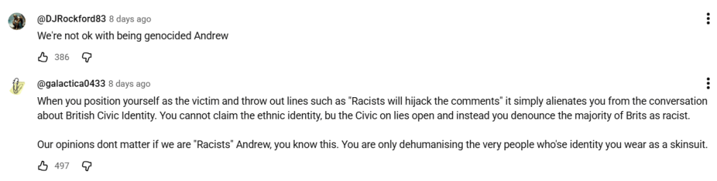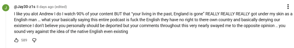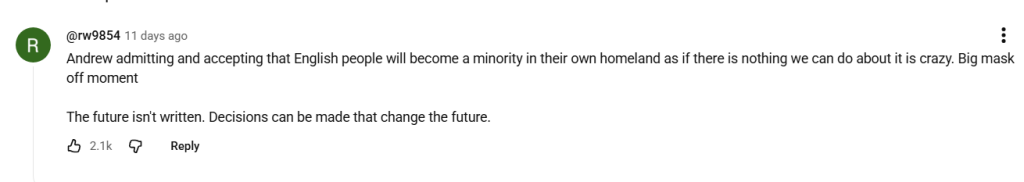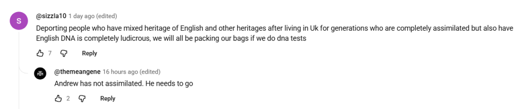 Furthermore, swathes of white nationalists aren’t merely concerned with race, but with immigration in general, including from other parts of Europe. Many in Andrew Gold’s comment section refer to Englishness as needing to go as far back as 1066. They surely haven’t taken a DNA test themselves.