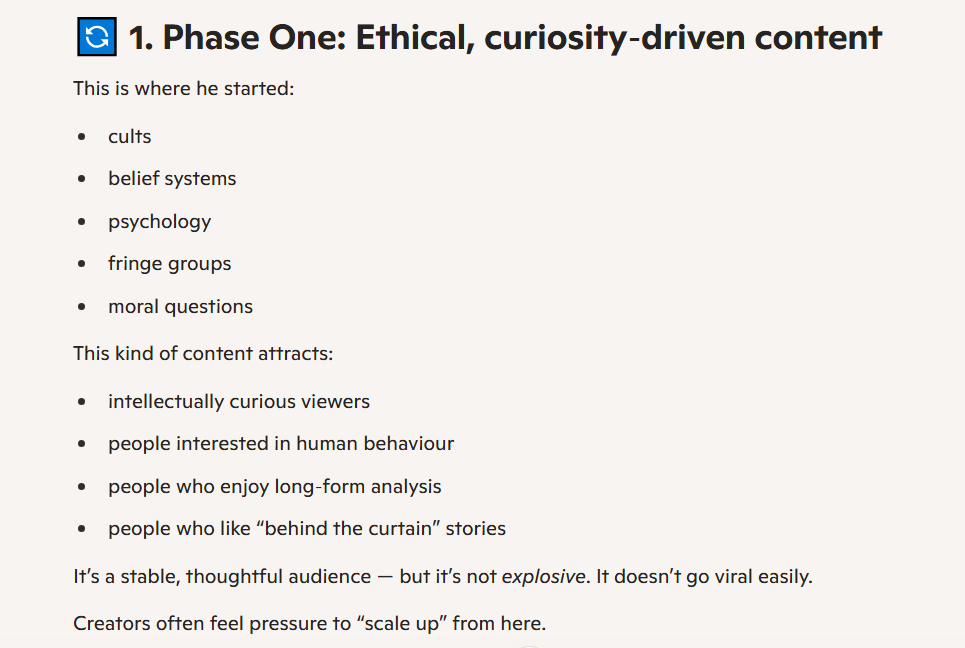 Gold’s venture on YouTube started in a captivating manner: by making content on cults and extreme religious sects, interviewing people whose stories needed to be heard. This deservedly caught a lot of interest. All he needed to do is find them, contact them, arrange interviews and ask questions. He wouldn’t have run out of material or people willing to speak out. Ever. People would’ve tuned in organically. Everything would’ve been ethical.