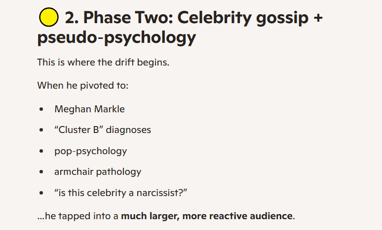 In 2022 he discovered the “narcopath” grift and ran with it, employing cheap tactics I described in this post. These could only remain unnoticed by an audience of low intellect. His audience became stupider overnight. He then boarded the “stalk Meghan Markle 24/7” train, which brought in more flotsam, in droves. His subscriber count skyrocketed. First to 100k, then 200k, now almost 800. He began focusing on the content that brought in more views, as opposed to his original niche.
