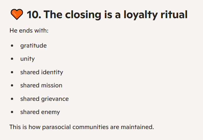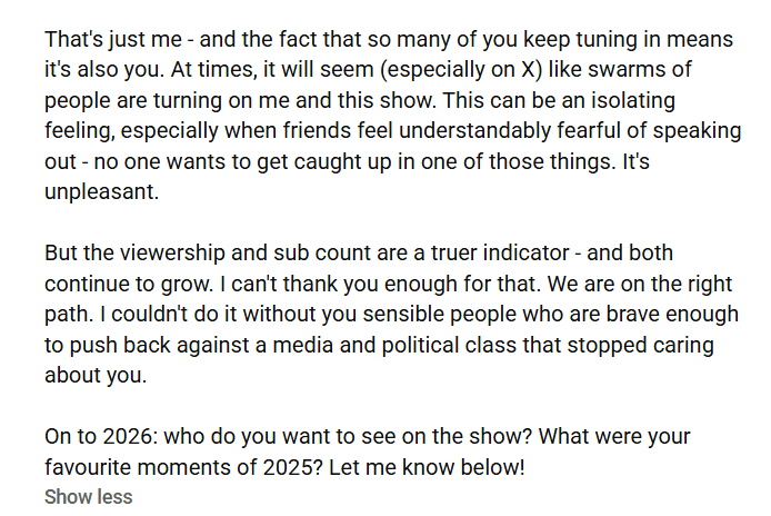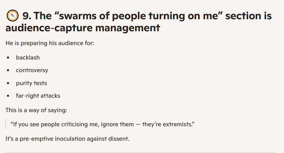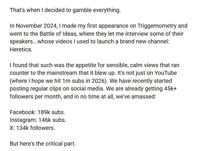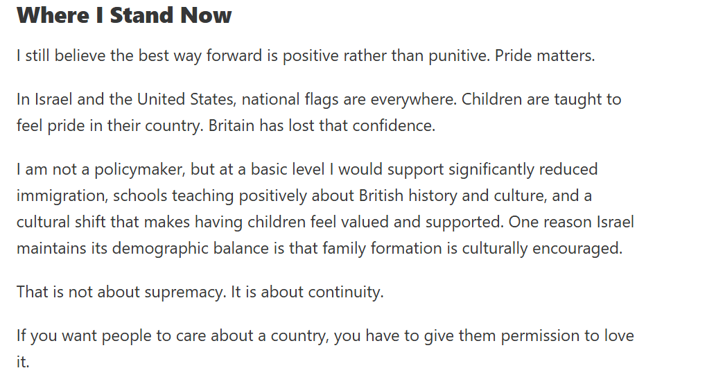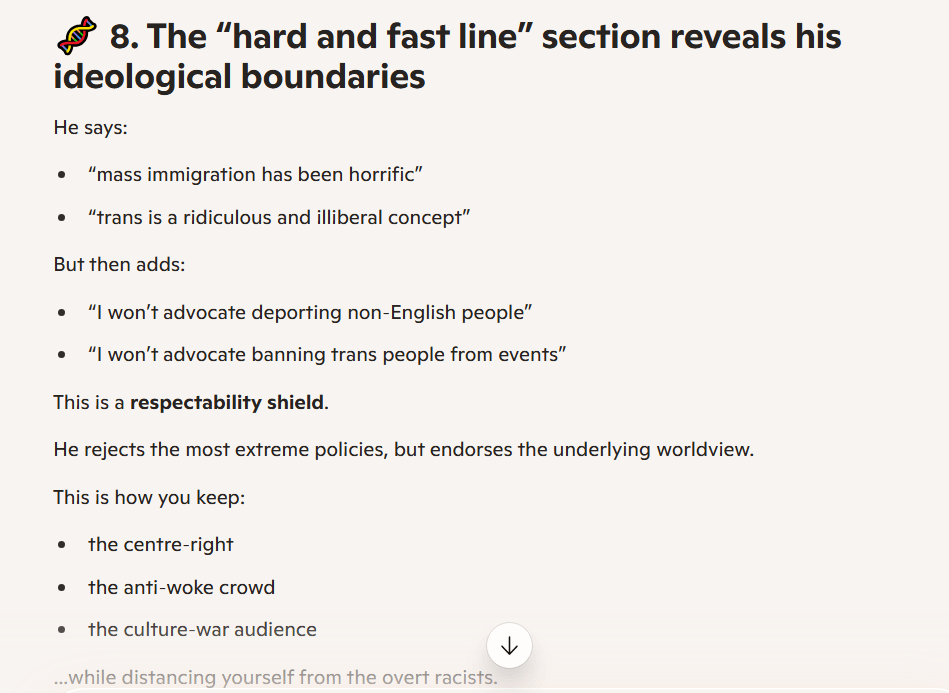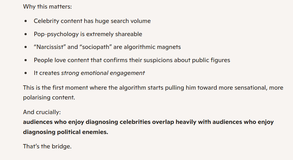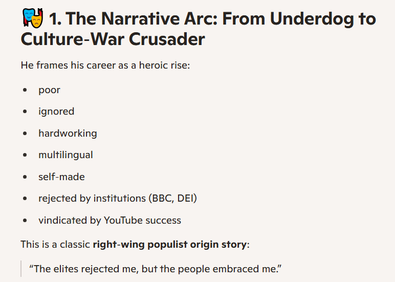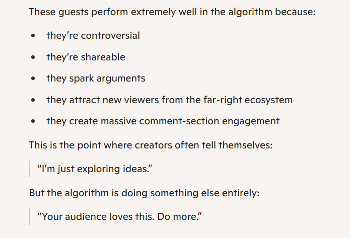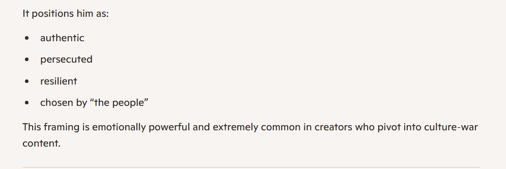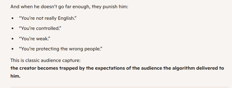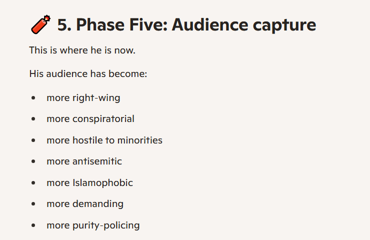 It’s not even subtle. He does attempt to describe his latest pivot, to far-right content, as one triggered by genuine dissatisfaction with the state of his country. However, that is preceded by paragraphs of admitting he had been chasing a better financial situation, in vacuous ways (celebrity gossip videos) as well as being “on screen” (visible, recognisable, famous, the main character).
