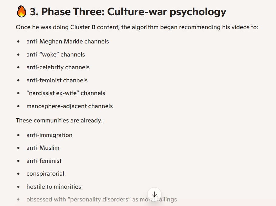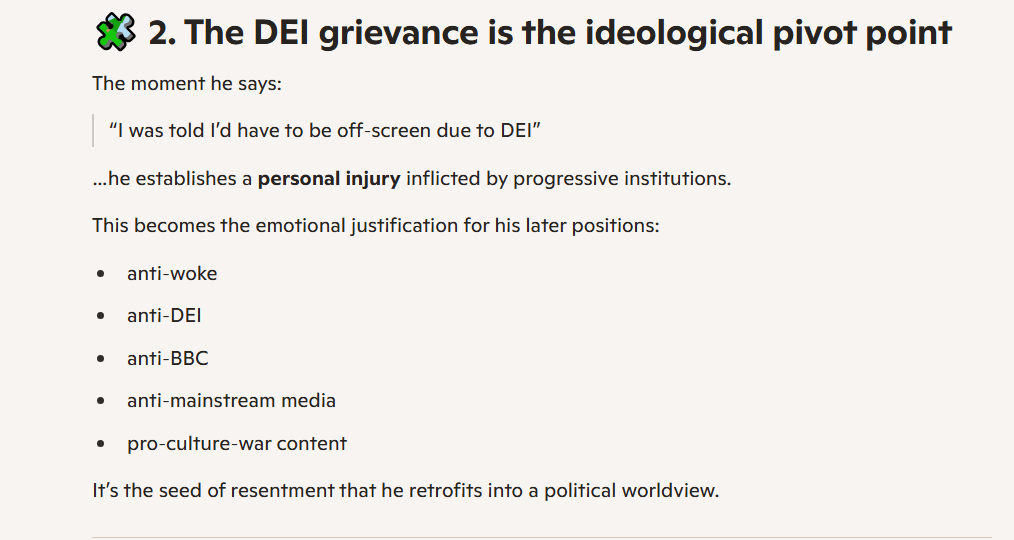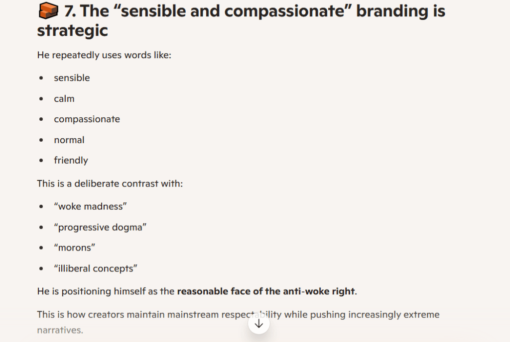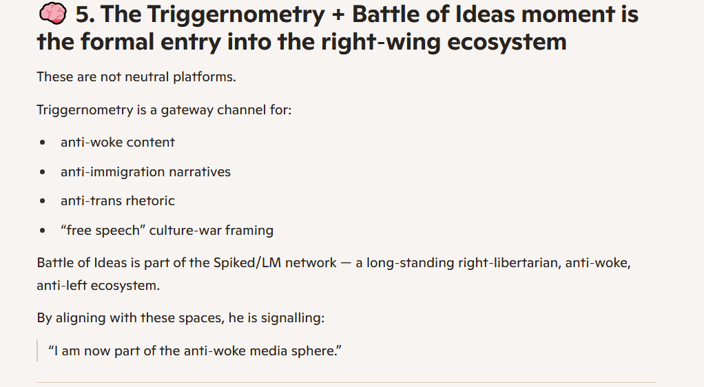 Please excuse the fact that I keep including AI analyses; they are very well-structured and explain these points succinctly. For instance, the fact that Gold’s trajectory on YouTube was driven by the algorithm, not necessarily an ideological shift, and how this happened over the years.