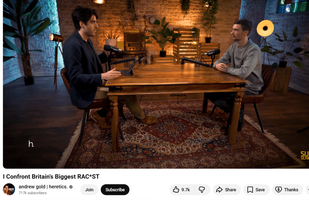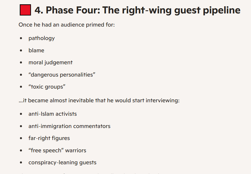 Lastly, and having amassed a right-wing audience through said methods, he pivoted to interviewing “controversial figures” on the right (far-right, quite often), courting the supporters of Tommy Ten Names. After October of 2023, he was, of course, activated against Muslims and took it from there.