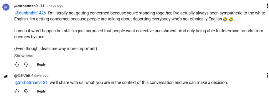 Here’s a conversation from Gold’s comment section, initiated (presumably) by an immigrant (or British person of colour) willing to pander to this crowd ideologically, while not being exactly like them.
