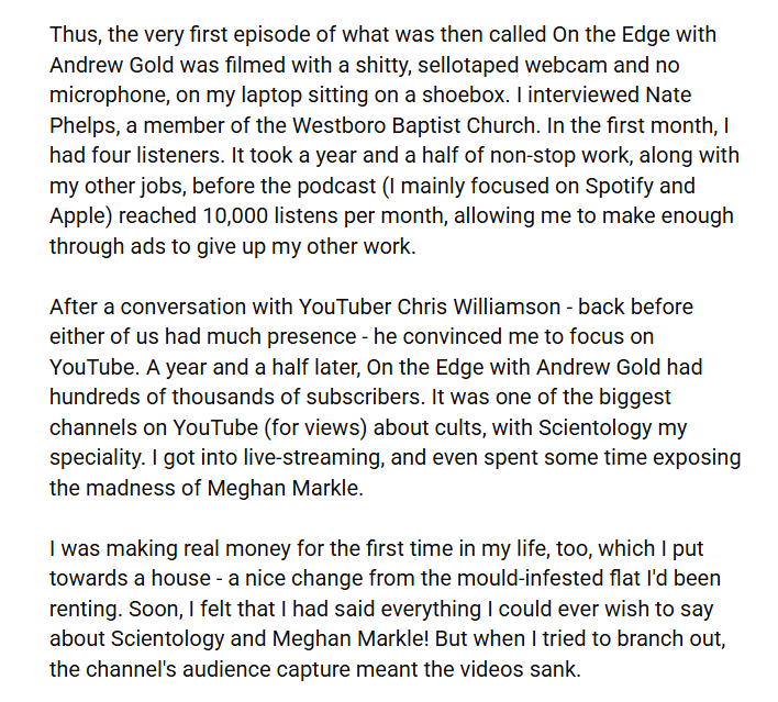 Scientology-based channels exist, which cover the cult in real time. One can never run out of things to say, unless news is quiet. The truth is that Gold used Scientology as SEO, even pasting Tom Cruise’s face in thumbnails for completely unrelated content, for clicks. He used the subject of cults to climb a ladder, content-wise. He wasn’t actually invested. He learned the bare bones and basic vocabulary to have a conversation on this subject, just like he did on Cluster B disorders.