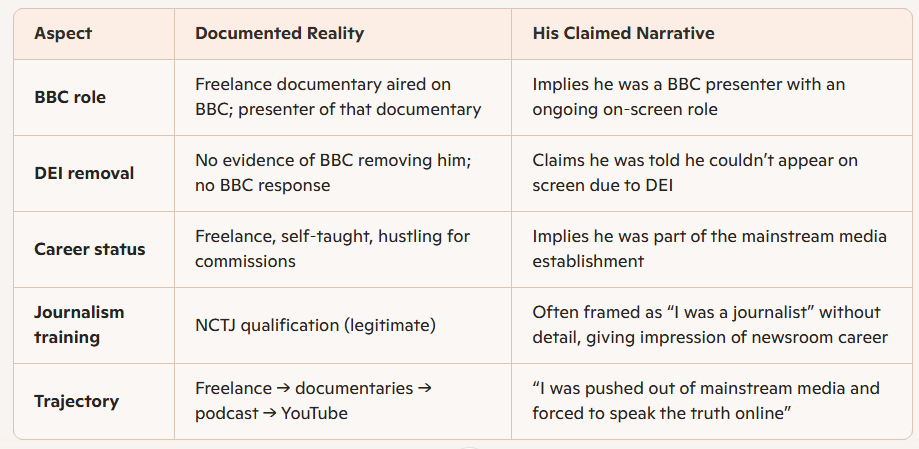 So he taught himself how to make documentaries. But he only made one, and swiftly chose a different career path. Perhaps because he sold it for “peanuts” after “two years of calling and emailing hundreds of TV channels”. DEI-related allegations, or whether the BBC wanted to actually hire him in the first place, just “off screen”, were never confirmed or responded to by the BBC and never detailed by him.