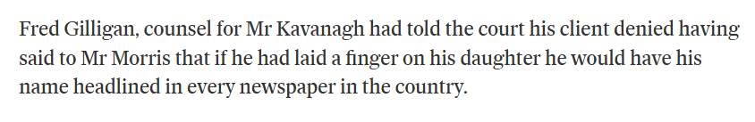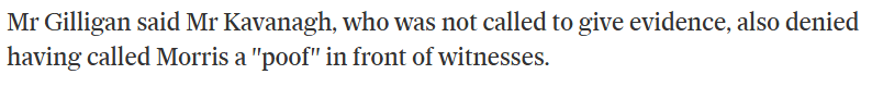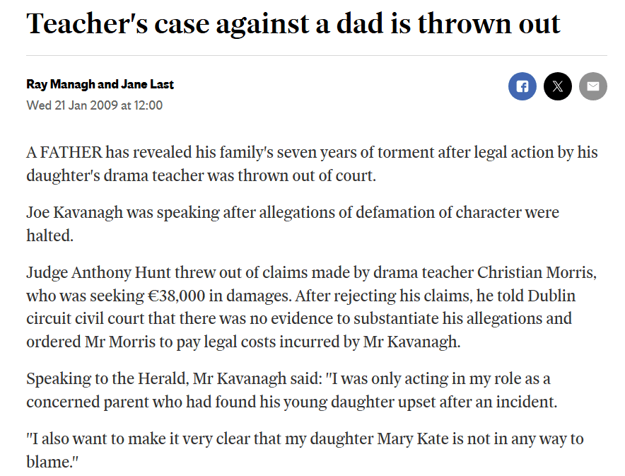 Instead, gardai were called to the school and the girl’s father was accused of calling Morris a poof (twice he has sued for this at least). Morris sued him for defamation, seeking the price of a small house in damages.