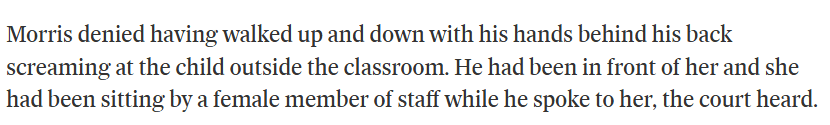 If you knew nothing about him, you might be tempted to think the child had perhaps exaggerated or misconstrued the situation. However, we do know that the man throws tantrums over small things and acts aggressively. Whatever Morris’s behaviour at the time, the child started crying. A normal person would comfort the child and reassure her that he hadn’t meant for that to happen. I’m confident 99.9% of people would put their annoyance aside and have natural empathy in that situation. Especially a grown man in a position of authority, realising he had intimidated a little girl. Never mind someone educated enough on children’s behaviour to be teaching them. It boggles the mind that his ego still came first.