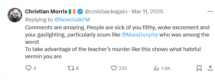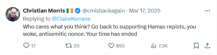 Here’s a small sample of how he communicates with those he disagrees with politically on X, such as Claire Kerrane TD, an elected official: