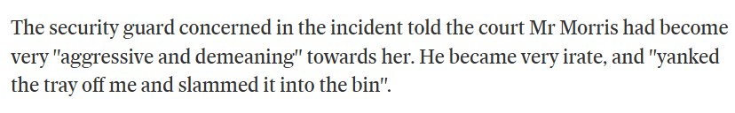 According to the article (which merely described what had transpired in court), Morris had found the chips too greasy, proceeding to wipe them with napkins and throwing said napkins on a table nearby, like a truly civilised person, unlike the immigrants he keeps complaining about. Knowing the typical layout of these venues, a bin couldn’t possibly have been that far away, and he had perfectly functioning legs. Anyone else would’ve placed the litter on their own tray, if they wanted to dispose of it later. The lack of respect towards staff having to clean the table again after his rude gesture was telling. He was, at the time, a teacher, namely someone who was supposed to instil good manners into young people. He was firmly told to pick up his litter.