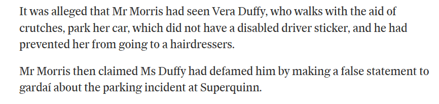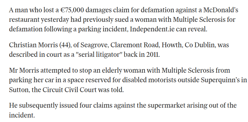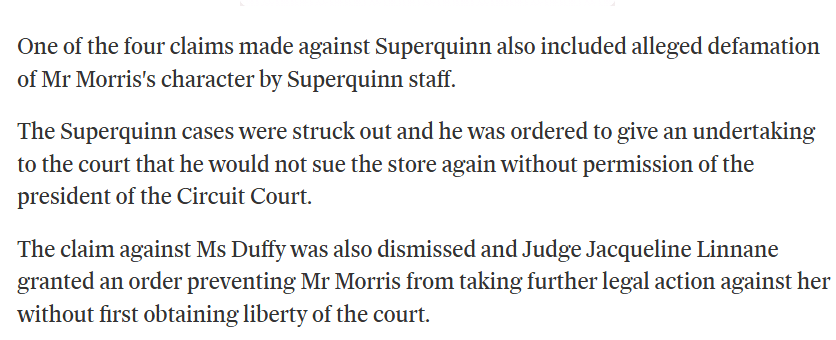 Morris had a history of frivolous litigation going back years. From the Irish Independent again: