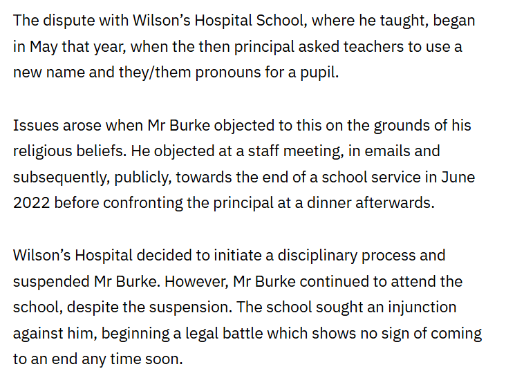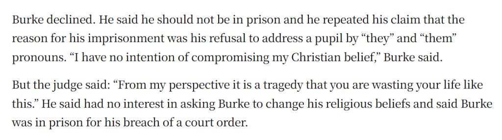 Burke, who now claims he was fired and later imprisoned for refusing to use they/them pronouns for a pupil, was not suspended for said act at all. He antagonised school staff for months, of his own initiative, unable to let it go. He was then suspended and continued to show up on the premises – which no sane person does. If you’re suspended or fired, you take a hike.