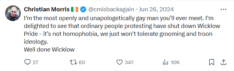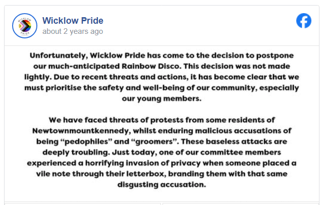 To correct him, fascists shut down one event, not the entirety of Wicklow Pride. They did this with spurious accusations that organisers were groomers and paedos. They targeted one person with a note through the letterbox, the underlying message being “we know where you live; we can come back”.
