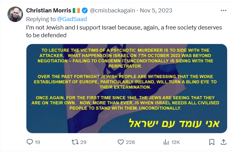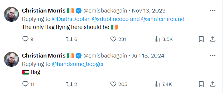At the height of the genocide in Gaza, there was a sudden far-right hysteria over Palestinian flags being flown in Ireland. Thomas Sheridan once claimed Irish children would not be able to distinguish between these flags and the Irish tricolour; that they would grow up not knowing which flag represented their country. Desperation for any argument makes propagandists come up with bizarre scenarios. Morris, of course, agreed.