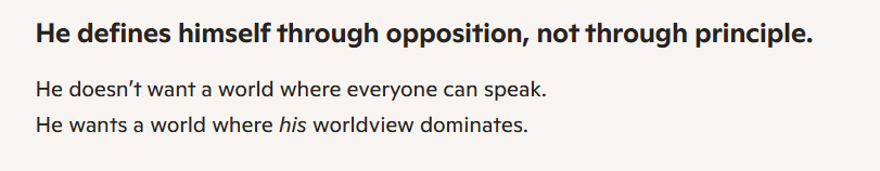 The second pattern one might notice is that when he engages in face-to-face conflict he tends to pick on women, unlikely to physically fight him. Just saying. He laments the “misogynistic” “trans agenda”, as well as the “rape culture” of countries refugees are fleeing from, while treating women aggressively every time he gets an opportunity.