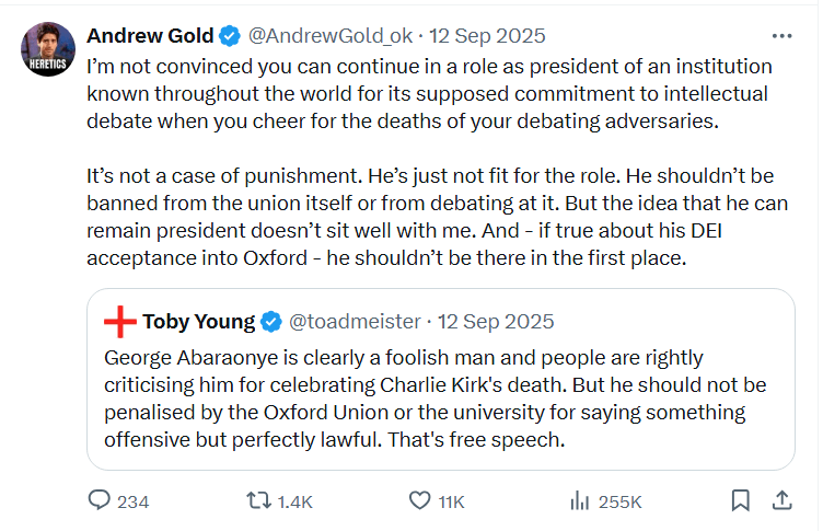 Gold, who cheered for Israel’s genocide in Gaza all throughout, and still does, suddenly became a delicate flower when someone failed to show empathy for Charlie Kirk’s death. He should lose his job over this, Gold reckoned. Free speech was subject to nuance now. Moral considerations. Offence.