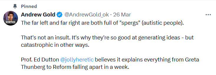 While the Middle East is on fire, affecting the entire world economically, Gold focuses on a fringe theory linking autistic people to political extremism, seemingly in need of another group to target.