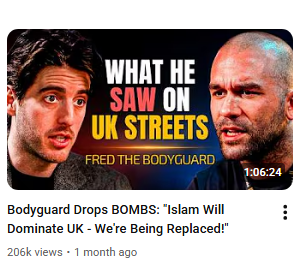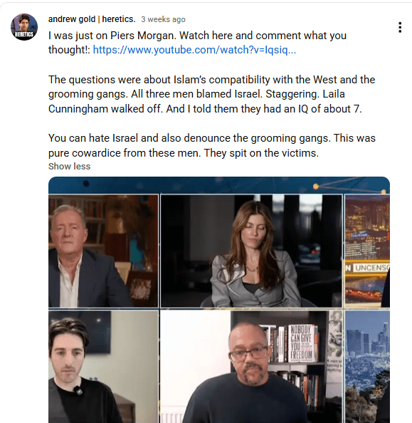 In the video screenshotted above, Gold interviews a Qatari political figure, perhaps a fringe one, given the title and implications. An internet search reveals he is a billionaire with a preference for nationalist platforms. I doubt Gold knows or cares what this man’s agenda is – he’s willing to regurgitate British far-right talking points, so it doesn’t make a difference. Anyone will do. He would interview a bridge troll or a frog willing to use fascist buzzwords.