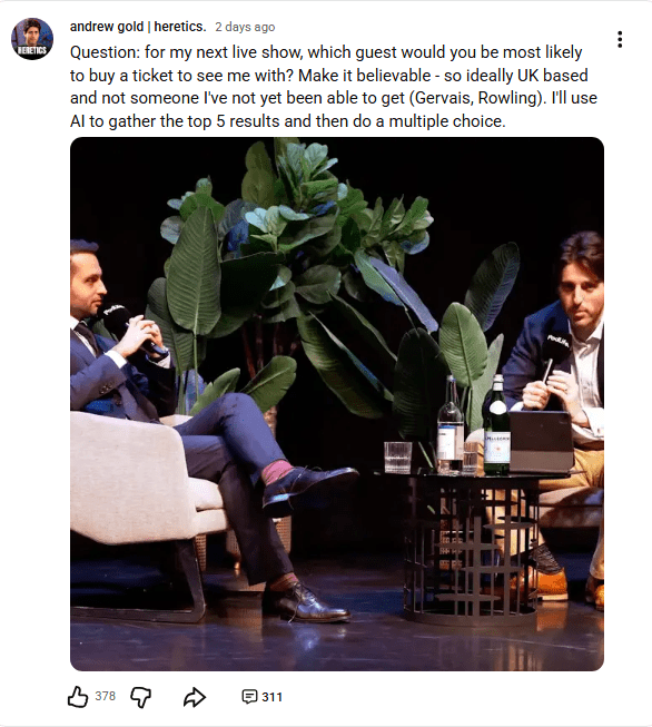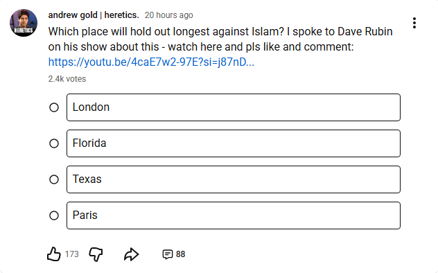 It’s been a month since the war of aggression on Iran was started, by the greatest threats to world peace, aka the US and Israel. Not only is it in the news 24/7, in some form; this war contains several elements Gold routinely focuses on: Muslims, Israel, Donald Trump and the so-called clash of civilisations invoked by the far-right. Gold’s silence for a month, pretending the war isn’t happening, is telling: he doesn’t know whose message to parrot yet. He’s calculating.
