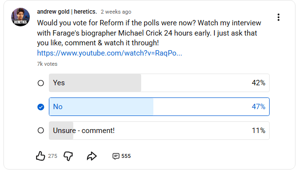 As to Reform councils, if you want frequent and detailed information on their shenanigans, BowlerHatMan is a channel covering and archiving the goings-on. It’s trailer park meets psychology study. By default, people drawn to Reform, especially when seeking positions of authority, have toxic traits making them disagreeable. They are unable to cooperate even with fellow raging bigots. They bicker, their egos flare up, they quit their jobs in hissy fits and defect to Restore. The melodrama is never-ending. An entire reality show can be made based just on councils run by Reform.