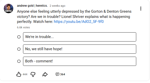 Gold is purely ideology and clique driven. He does not give half a turd about the wellbeing of his compatriots, locally or nationally. The election he references above was a small but significant win for the Green party. Their candidate, Hannah Spencer, was a young woman, plumber by profession and training to be a plasterer, which she has now achieved. A working class person, who gave one of the most inspiring maiden speeches, of solidarity with the working class and unity. It was truly moving and one rarely hears anything moving in Parliament. Hats off to her and hopefully, many more Green victories to come.