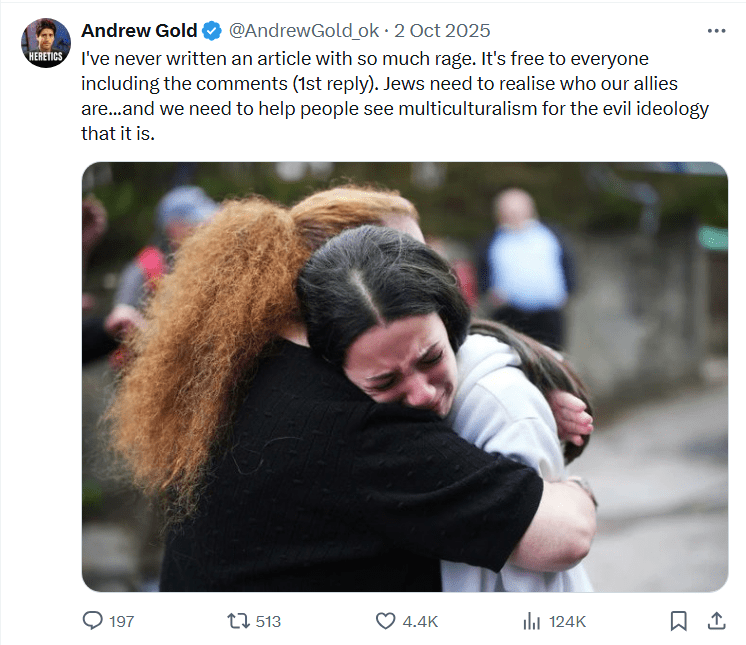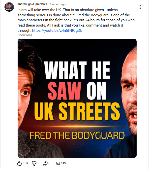 For a few years, Gold had pretended to be centrist, rejecting extremism and indoctrination in any form (apart from Zionism, of course). He had created the façade of a politically moderate, anti-cult documentarian. The itch for clicks and money drove him increasingly to the right, using outrage baiting, then into the far-right. He has now arrived at the final bus stop – and there is no going back.