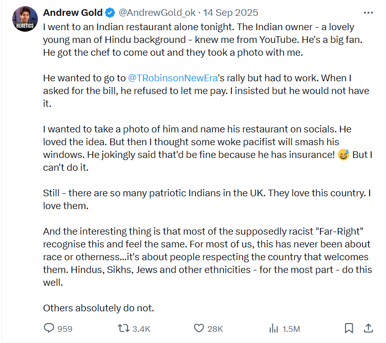 If the story is real, the restaurant owner wanted Gold to promote him, and Gold eventually refused, even after having eaten there for free. The effort involved would’ve been a few clicks. A Tommy Robinson aficionado isn’t afraid to declare his mentality in public. Given that both he and the chef had taken photos with Gold, they could’ve posted them online themselves. So why deny the owner the online promotion? That would make Gold an arsehole. After the free meal, he gets to use the story and the owner gets nothing at all.